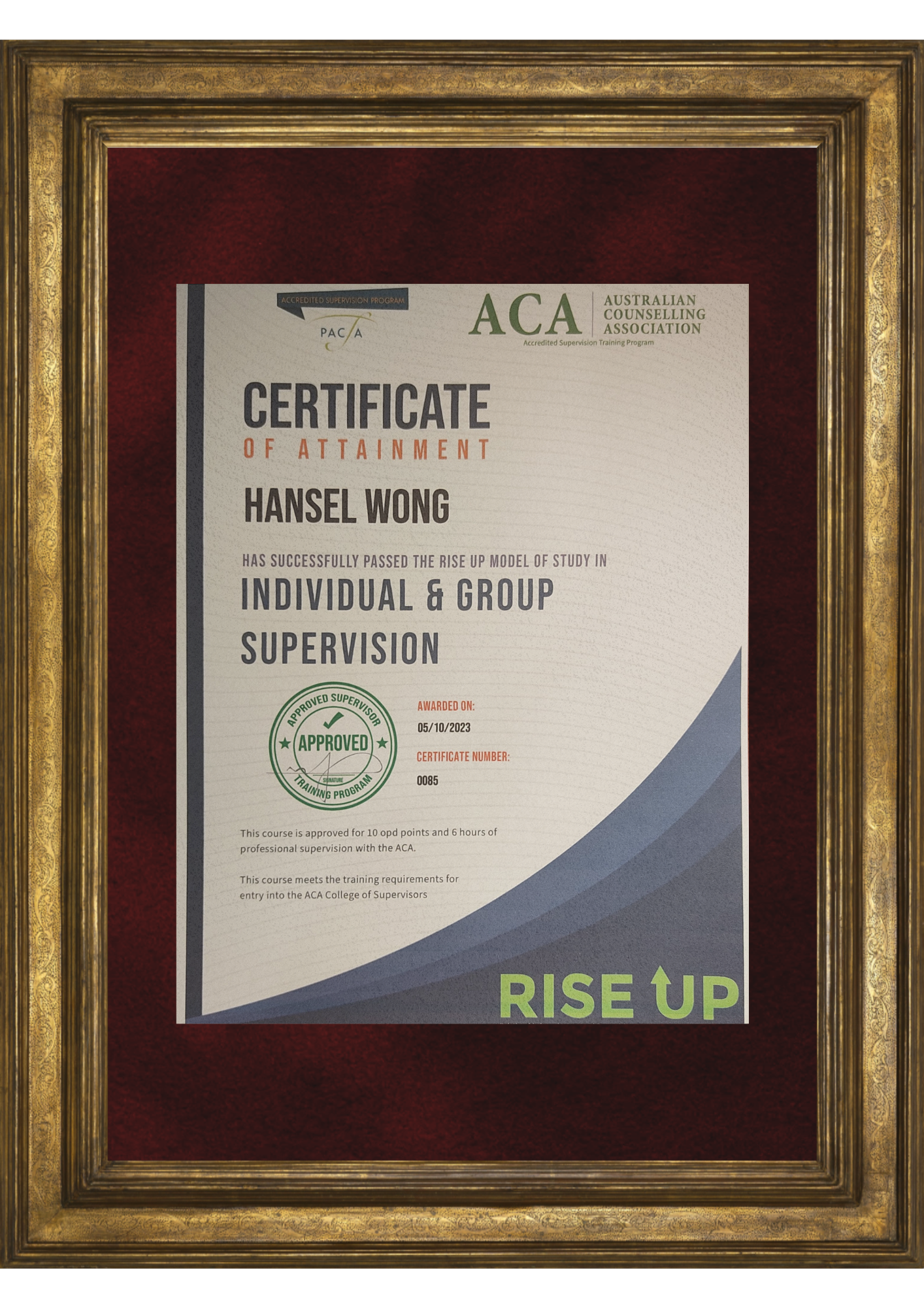 Licensed in Malaysian and Australia and certified supervisor recognised by ACA and PACFA and implement the RISE UP model in my supervision sessions, which include:
